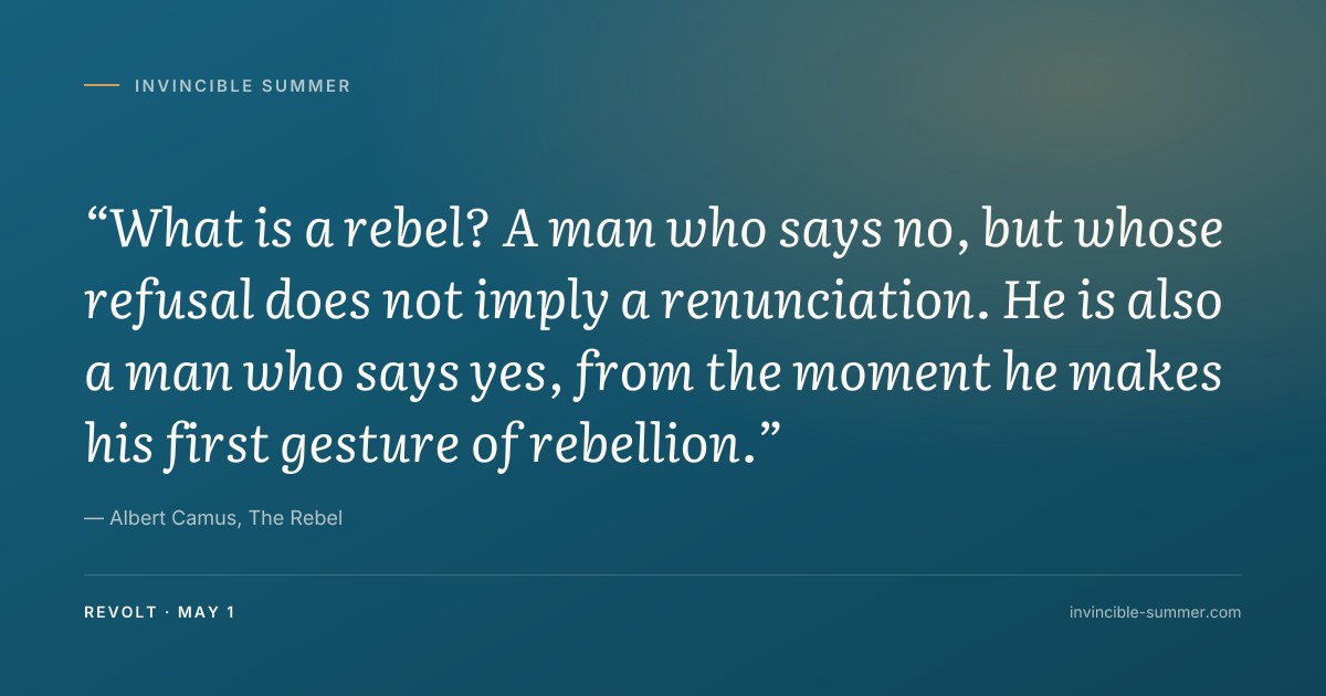 This is the opening of revolt, and it is rarely loud. It often starts as a quiet refusal you cannot fully explain. Camus is offering a frame for that refusal. Underneath the no is a yes you have not yet learned to articulate. When you find yourself unable to agree to something, ask what the unspoken yes might be. That is the value you are protecting. Today is the first day of a month spent with revolt.